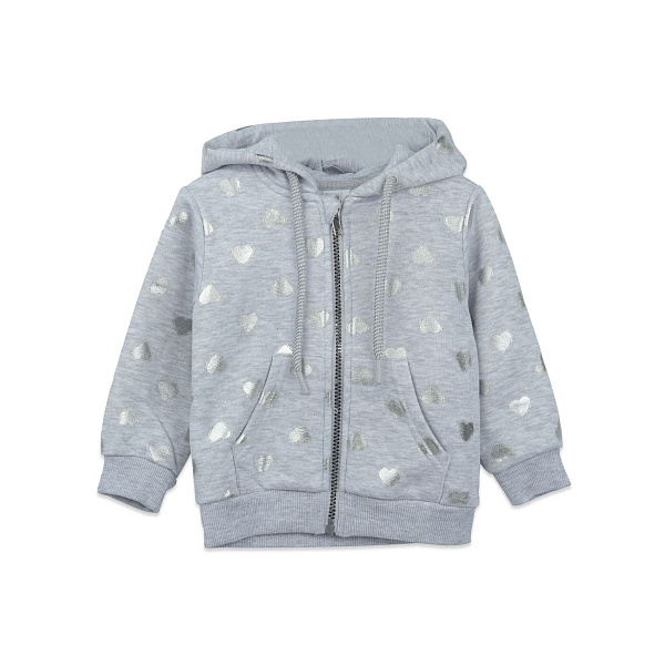 Толстовка на молнии с капюшоном из френч-терри изготовлена из мягкой ткани спокойного серого цвета и декорирована термопечатью в виде небольших сердечек по всей ткани. Изделие можно надевать под куртку зимой, а также оно будет уместно как верхняя одежда на футболку, надетая прохладным вечером. Объемный капюшон, рукава на манжетах и притачной пояс по низу толстовки будут защищать ребенка от холодного ветра. Завершают дизайн небольшие декоративные карманы. В основе ткани использован натуральный хлопок с добавлением полиэстера – комбинация нитей делает кофту мягкой и приятной к телу. Рекомендовано для детей ясельного возраста.