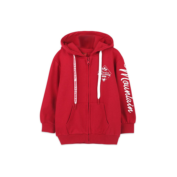 Стильная утепленная толстовка красного цвета придется по душе каждому ребенку дошкольного и школьного возраста. Изделие сшито из плотной хлопковой ткани, в качестве утеплителя использован флис на базе полиэстера. Материал плотный, при этом в меру эластичный, обеспечивает приятные тактильные ощущения, легко растягивается и бережно сохраняет тепло. Свободный крой не сковывает движения, а глубокий капюшон укроет голову и шею от ветра. Низ рукавов и кофты дополнен эластичными манжетами, они плотно прилегают к коже и не пропускают холодный воздух. В качестве застежки использована молния. Завершают дизайн белые шнурки, небольшой принт и небольшие карманы.