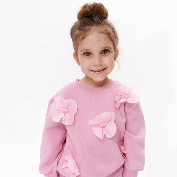 Утепленный свитшот с объемными цветами станет ярким акцентом в гардеробе каждой маленькой модницы. Модель выполнена в нежно-розовом цвете. Украшение в виде объемных цветов придает изделию праздничный вид.