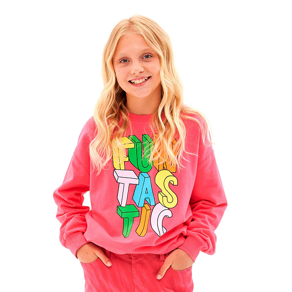 Утепленная толстовка ярко-розового цвета с креативной надписью на груди «FUNTASTIC» — веселая игра слов, которая добавляет бодрости и настроения. Буквы выполнены в объемном стиле и окрашены в разные яркие цвета. Такая толстовка поднимет настроение.
