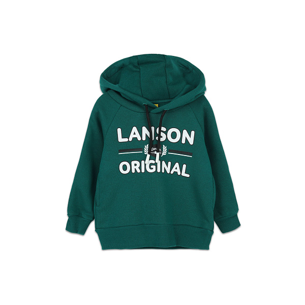 Темно-зеленая толстовка с теплой внутренней подложкой из полиэстера, капюшоном на длинных шнурках и с удлиненными рукавами дополнит гардероб ребенка в прохладное время года. Свободный крой не сковывает движения, а длинные рукава и низ кофты дополнены эластичными манжетами, они плотно прилегают к телу и не пропускают холодный воздух. Капюшон глубокий, с длинными шнурками они укроют голову ребенка от холода и защитят шею от ветра. Передняя сторона украшена надписью «Lanson Original» белого цвета. Рекомендовано для детей ясельного возраста.
