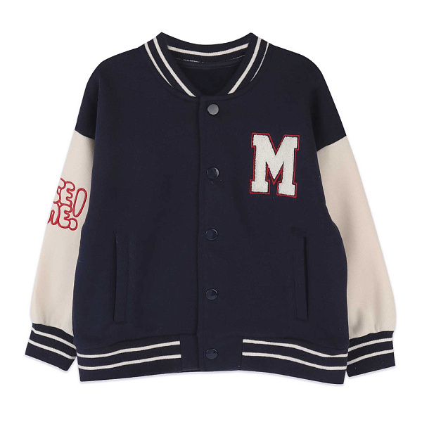 Толстовка утепленная для мальчиков выполнена в сочетаниях темно-синего и кремового цветов. Декоративные элементы в виде буквы "M" на груди и яркой надписи на рукаве придают изделию модный и спортивный вид. Изготовленная из 60% хлопка и 40% полиэстера, толстовка сочетает комфорт и прочность.