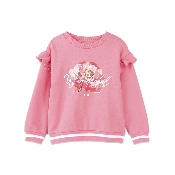 Толстовка органично впишется в гардероб девочки дошкольного возраста. Модель привлекает внимание нежной цветовой гаммой и крылышками в области плеч. В качестве украшения использовано изображение цветка, надписи на груди и контрастные полоски на манжетах и по низу изделия.