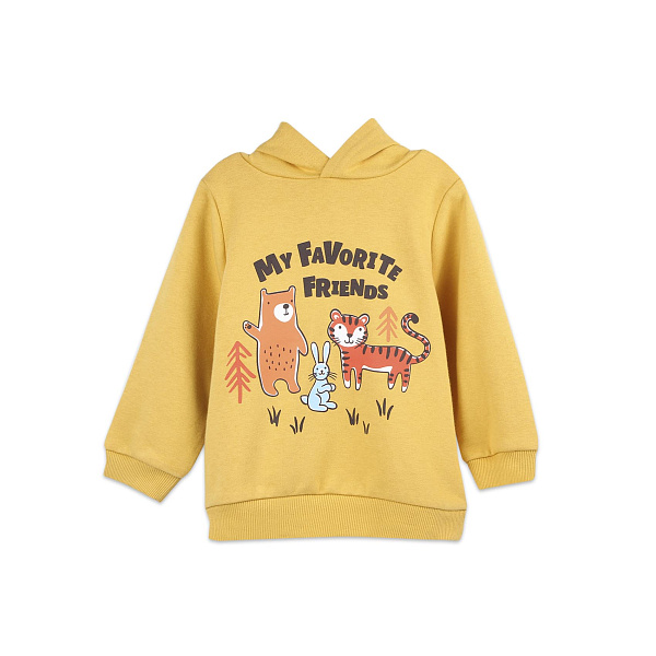 Толстовка выполнена в горчичном цвете, ее передняя часть украшена принтом – изображениями медведя, зайца и тигра с надписью. Толстовка хорошо сочетается с выходной или спортивной одеждой и обувью.