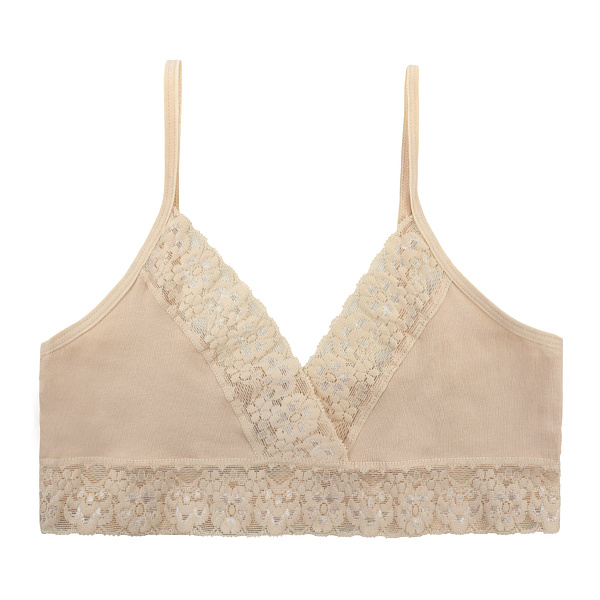 Бельевой топ для девочки выполнен в бежевом цвете. Тонкие бретельки фиксируют топ на плечах. Кружево обрамляет V-образный вырез спереди. Нижний край также украшен кружевом. Топ хорошо сидит на теле благодаря эластичному материалу. Дизайн топа минималистичный и аккуратный.