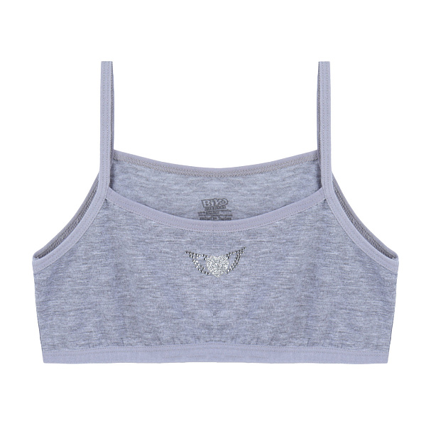 Бельевой топ для девочки выполнен в сером цвете. Тонкие и мягкие бретельки удерживают топ на плечах. На груди размещено небольшое украшение в виде крыльев с блестками. Топ подходит для ежедневного ношения под школьной или повседневной одеждой. Дизайн топа простой и лаконичный.