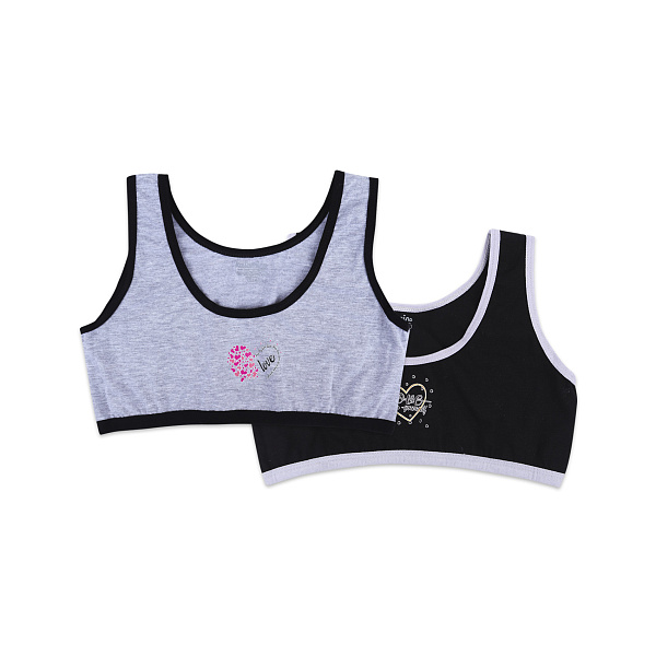 Набор предназначен для девочек. В него входит пара топов на широких бретельках с контрастной отделкой. В качестве украшения использованы миниатюрные рисунки в форме сердечек. Для пошива применяется тонкий трикотаж в составе которого использовано 93% хлопка и 7% эластана. Материал обеспечивает приятные тактильные ощущения, устойчив к износу, не растягивается. Полотно отлично пропускает воздух, быстро впитывает влагу. Допускается ручная и автоматическая стирка, при выборе режима которой следует учесть рекомендации производителя.