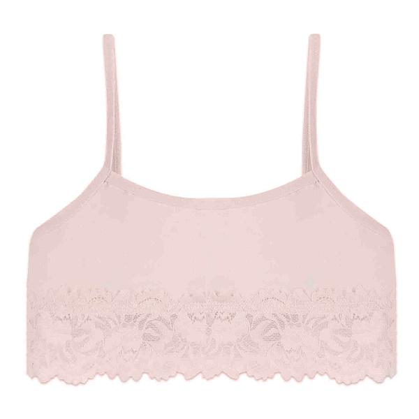 Топ бельевой для девочки имеет бежевый цвет. Тонкие бретели фиксируют изделие на плечах. Нижний край отделан кружевом. Дизайн прост и аккуратен. Топ надевается легко через голову. Форма сохраняется после стирки. Ткань мягкая на ощупь. Кружево добавляет нежности.