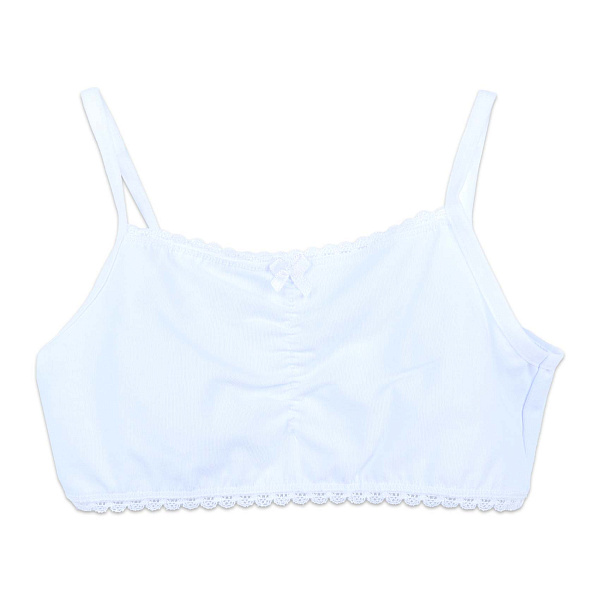 Топ для девочек выполнен из мягкой и приятной к телу ткани, состоящей из хлопка и эластана, что обеспечивает отличную посадку и комфорт при носке благодаря легкой эластичности. Модель белого цвета отличается лаконичным и аккуратным дизайном с тонкими бретелями и нежной декоративной отделкой в виде кружевной тесьмы по нижнему краю и верхнему срезу. Спереди топ украшен небольшим декоративным бантиком, придающим изделию изящность и женственность.