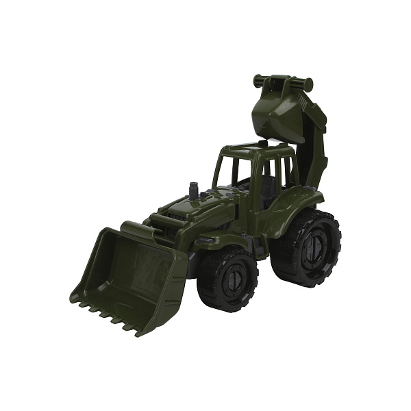 Военный трактор серии ИВАН на свободном ходу. Модель оснащена двумя ковшами спереди и сзади. Большие колеса легко разгоняются при ручном запуске. У ковша сзади есть гнущееся подъемно плечо, в точности как у настоящей машины. На кузове трактора много дополнительных деталей, добавляющих игре реализма.
