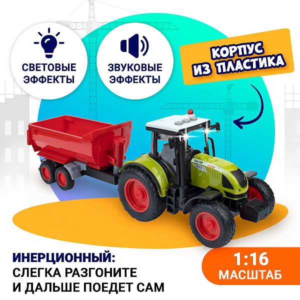 Мощный трактор дополнен прицепом с высокими бортами для перевозки небольших грузов. Техника оснащена механизмом инерционного типа, а также имеет световое и звуковое сопровождение. Такой подарок обрадует каждого мальчика старше 3 лет, станет поводом для продолжительных детских игр. В процессе реализации захватывающих игровых сюжетов активируется воображение, логическое мышление, моторика рук. Корпус изделия изготовлен из прочного сертифицированного пластика, в составе которого нет токсичных веществ. Гладкий материал не впитывает влагу, не выгорает на солнце, устойчив к механическим нагрузкам.
