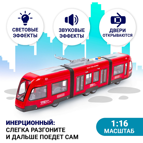 Яркий трамвай оснащен механизмом инерционного типа, световыми и звуковыми опциями. Игрушку можно предложить ребенку старше 3 лет. Его заинтересует реалистичный внешний вид, а также открывающиеся двери. В процессе увлекательной игры детям понадобится воображение, умение мыслить логически, выстраивать сложный сюжет. Манипуляции с изделием положительно влияют на моторику рук, улучшают координацию движений. Корпус из прочного сертифицированного пластика не боится механических нагрузок и не выгорает на солнце в процессе игры. Такой материал не содержит вредных химических соединений, безопасен для детского организма.