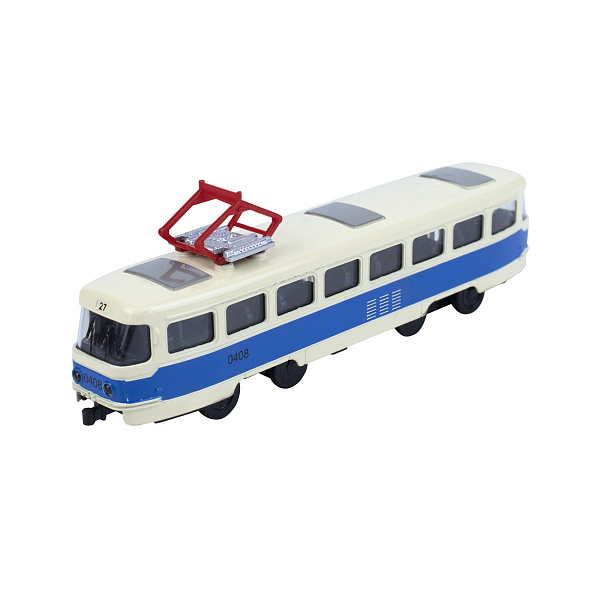 Масштабированная модель трамвая создана специально для ценителей реалистичных авто. Она непременно разнообразит сюжетно-ролевые игры или дополнит коллекцию юного автолюбителя. Машинка выполнена в бежево-синих оттенках корпуса, имеет красные стрелы, номер «27». Также она оснащена открывающимися дверями со звуковым и световым сопровождением, при открытии которых загораются белые фары. Благодаря прозрачным окнам можно рассмотреть детальную проработку салона.