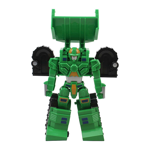 Трансформер Starby выделяется ярким насыщенным зеленым цветом кузова, который напоминает настоящую строительную технику. В образе машины это мощный гусеничный бульдозер с крупным ковшом и прочными черными гусеницами, готовый к любым задачам. В фигурке робота сохранилась брутальная уверенность: широкие плечи, крепкие ноги и выразительная голова делают образ впечатляющим и динамичным.