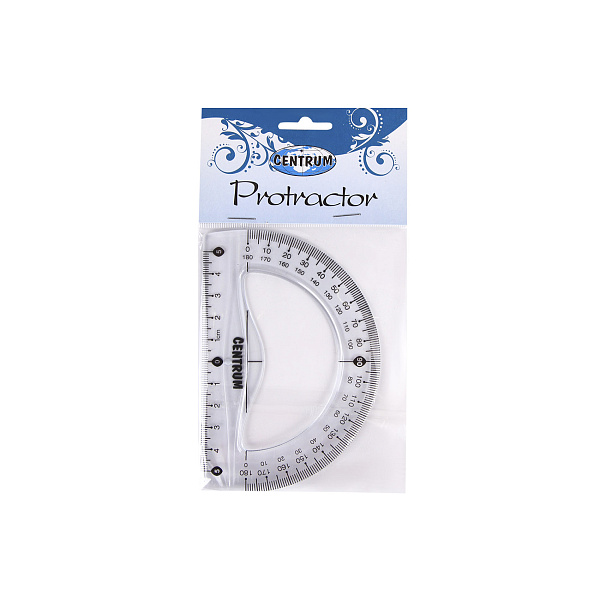 Действительно удобный транспортир – это простой транспортир. Данный прибор тщательно продуман и не требует дополнительных излишеств и вычурности – только лаконичный дизайн и ничего лишнего. Транспортир изготовлен из прозрачного пластика, что имеет большое значение при построении углов: через прозрачный прибор проще ориентироваться на листе бумаги, точках и координатах. Основание транспортира размечено как линейка на 10 сантиметров. Верхняя дуга размечена шкалой градусов. Внутренняя часть транспортира представлена волнистым овалом. Центр отмечен простой линией, которая пересекается перпендикулярно с основанием – благодаря данной разметке транспортир удобно совмещать с линиями и точками.