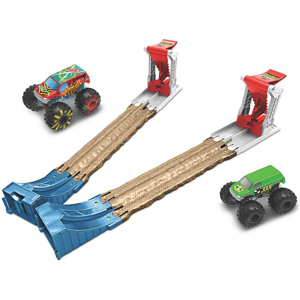 Встречайте игровой набор Hot Wheels 3в1 с литыми металлическими монстр-траками Демо Дерби и Краш Рекрут в масштабе 1:64, двумя пусковыми установками с короткими прямыми трассами и пандусами, чтобы дети могли придумывать грандиозные столкновения машинок лицом к лицу! С этим набором его ожидают захватывающие способы игры!