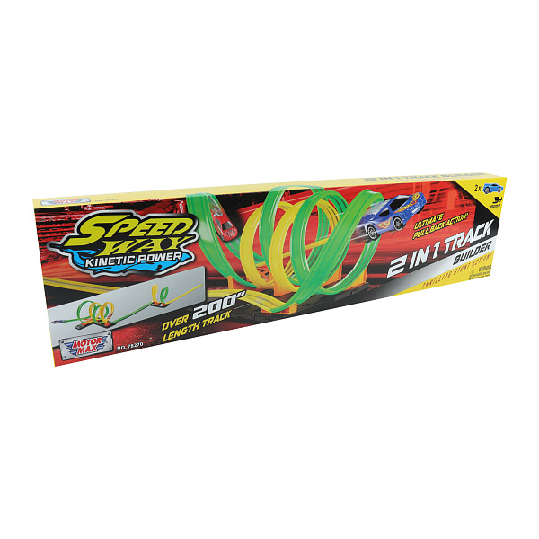 Игровой набор состоит из дорожки с вертикальными кольцами и двух машинок.