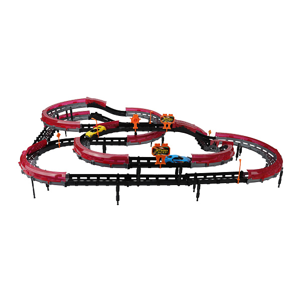 Яркий дизайн с красными и черными деталями привлекает внимание. Трек состоит из крутых виражей, подъемов и спусков, делая гонку динамичной и интересной. Машинки активируются с помощью пусковых механизмов. Трек легок в сборке, а конструкция устойчива и надежна.