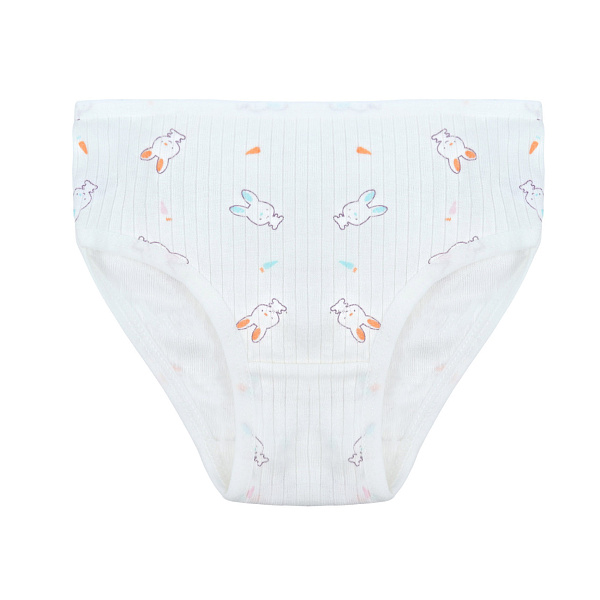 Трусики для девочек сделаны в белом цвете. Ткань имеет текстуру с вертикальными полосками. По всей поверхности разбросаны изображения зайчиков. Рядом с ними нарисованы оранжевые морковки. Цвета принта пастельные: розовый, голубой и оранжевый. Состав ткани включает 95% хлопка и 5% эластана. Материал сохраняет вид после стирок. Форма трусиков классическая, посадка средняя. Трусики предназначены для ежедневной носки.