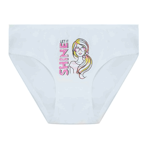 Трусы для девочки имеют белый цвет. Они украшены принтом на передней части. Трусы сделаны из 95% хлопка и 5% эластана. Ткань пропускает воздух. Трусы сидят по фигуре. Они предназначены для девочек. Форма трусов классическая. Край по бокам ровный. Ткань мягкая на ощупь. Принт яркий и четкий. Трусы подходят для повседневной носки.