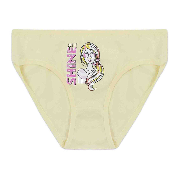 Трусики для девочек выполнены в желтом цвете. На передней части размещен принт с изображением девушки и надпись. Розовые элементы добавляют яркости дизайну. Ткань содержит 95% хлопка и 5% эластана. Форма трусиков простая и удобная. Сзади трусики имеют гладкую поверхность без узоров. Они подходят для ежедневного использования. Материал сохраняет форму после стирок. Трусики легко надеваются и снимаются.
