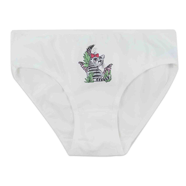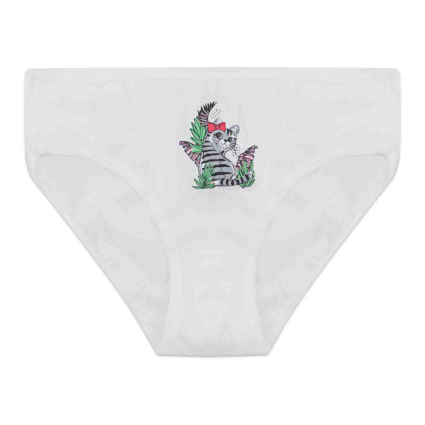 Трусики белого цвета предназначены для девочек. На передней части размещен принт с кошкой. Сзади трусики гладкие без рисунка. Форма классическая с широкой посадкой.