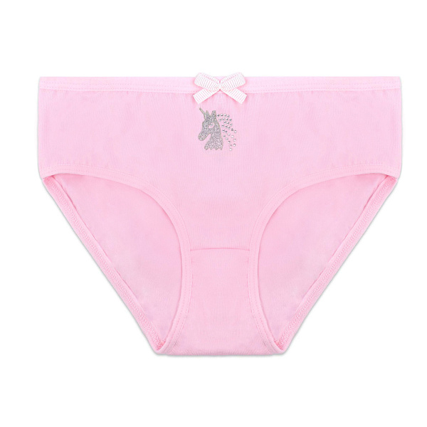 Однотонные трусы розового цвета предназначены для девочки. На лицевой стороне расположена аппликация в виде единорога. Модель подходит для повседневной носки.