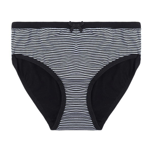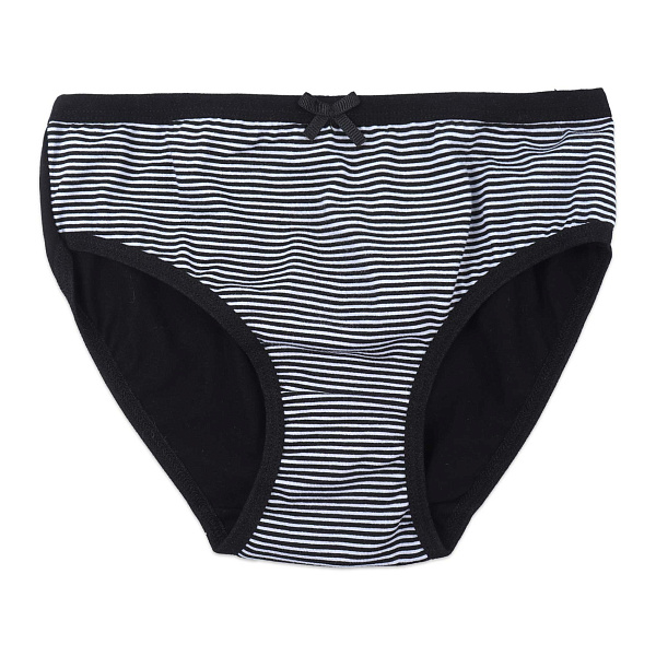 Трусы для девочек выполнены в классическом черном цвете и тонкими горизонтальными белыми полосками. Модель украшена небольшим черным бантиком, добавляющей изящества и аккуратности. Удобный крой и эластичные окантовки обеспечивают надежную посадку и комфорт при носке.