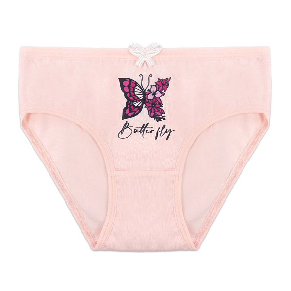 Трусы для девочек выполнены в нежном розовом цвете с ярким принтом в виде бабочки и надписью "Butterfly". Модель украшена небольшой аккуратной ленточкой на поясе, добавляющей изделию изящества и нежности. Ткань мягкая и эластичная, обеспечивая комфорт и хорошую посадку.