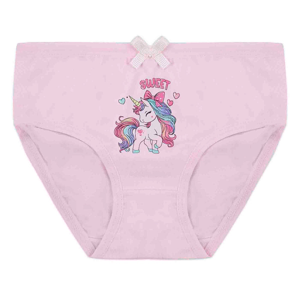 Трусы для девочки с принтом единорога имеют розовый цвет. На передней части изображен радужный единорог с длинной гривой и сердечками, надпись Sweet и бантик.