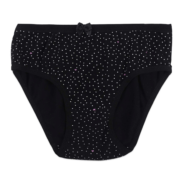 Трусы для девочек выполнены в черном цвете с мелким принтом из белых точек и акцентных сердечек, создающим изящный и стильный узор. На поясе расположена небольшой бантик, добавляющая изделию нежности. Модель отличается удобным кроем и эластичными окантовками, которые обеспечивают комфортную посадку и не сдавливают.