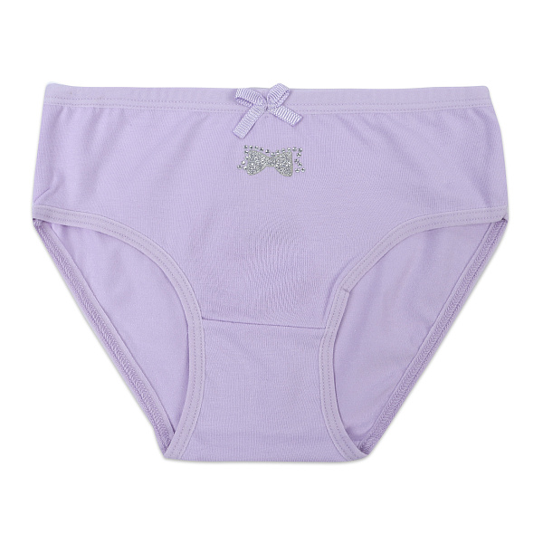 Трусы для девочек выполнены в нежно-лиловом цвете, что придает им мягкость и женственность. На передней части пояса расположен декоративный бантик из тонкой ленты, а чуть ниже — объемный аппликационный бант с блестящими стразами, создающий праздничное настроение. Крой изделия — классический, с эластичной резинкой по талии и по боковым швам, обеспечивающей комфортную посадку без давления. Швы аккуратные, внутренняя часть гладкая, что делает изделие приятным к телу.