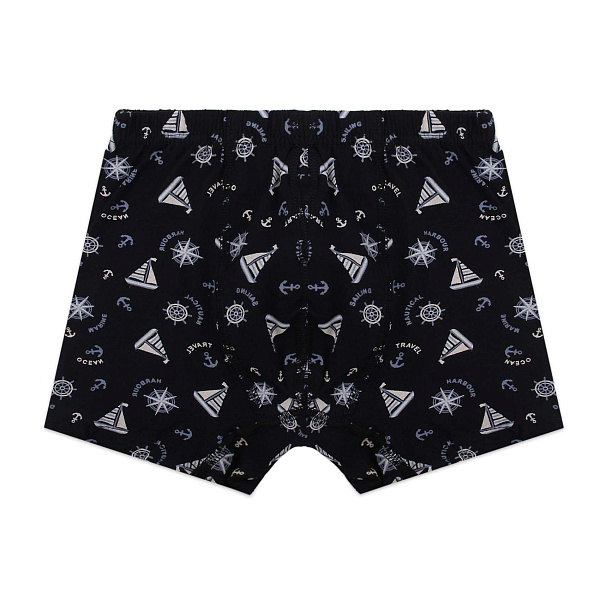 Трусы-боксеры в черном цвете для мальчика с стильным морским принтом и изображениями парусников, компасов и якорей, который придает изделию оригинальность и динамичность. Удобная посадка и мягкая резинка на талии обеспечивают комфорт и надежную фиксацию, предотвращая скольжение. Эти трусы-боксеры станут удобным и практичным выбором для повседневной носки, поддерживая комфорт в течение всего дня.
