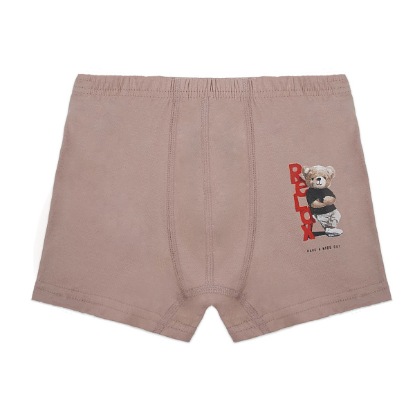 Трусы-боксеры для мальчика бежевого цвета — удобная и практичная модель для мальчиков. Изделие выполнено в классическом стиле с плотной посадкой и короткими шортами, что обеспечивает комфорт и свободу движений в течение всего дня. На боковой части присутствует милый принт с изображением медвежонка и надписью «RELAX».