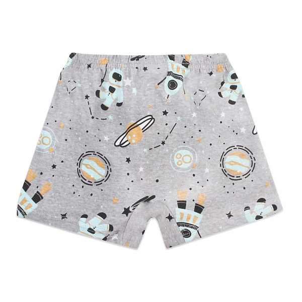 Детские боксеры выполнены в светло-сером цвете с ярким и забавным космическим принтом и изображением планет, звёзд и маленьких космонавтов. Такая яркая расцветка придаёт изделию привлекательность. Эластичный пояс обеспечивает комфортную посадку и не сдавливает тело, позволяя ребёнку свободно двигаться.