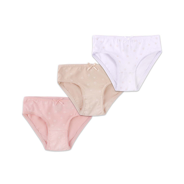 Трусы-плавки для девочек на каждый день. В наборе три изделия в бежевом, голубом и розовом цветах. Модели украшает рисунок в виде миниатюрных цветов. Мягкие кружевные резинки пришиты на поясе и в районе ног. Эта деталь не только делает трусики более аккуратными и милыми, но позволяет ребенку чувствовать себя комфортно в процессе носки.