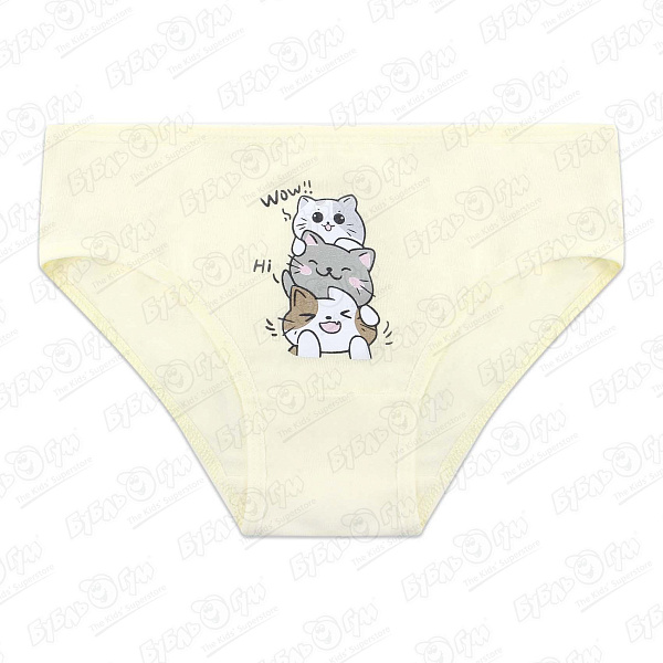 Трусы желтого пастельного цвета станут прекрасным дополнением в гардероб девочки. На передней части изделие украшено милым принтом с изображением трех котят. Спокойный оттенок и аккуратный крой делают изделие комфортным и удобным в носке.