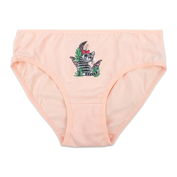 Детские трусы для девочки выполнены в теплом персиковом цвете. На передней части расположен забавный рисунок кота. Модель предназначена для повседневной носки.