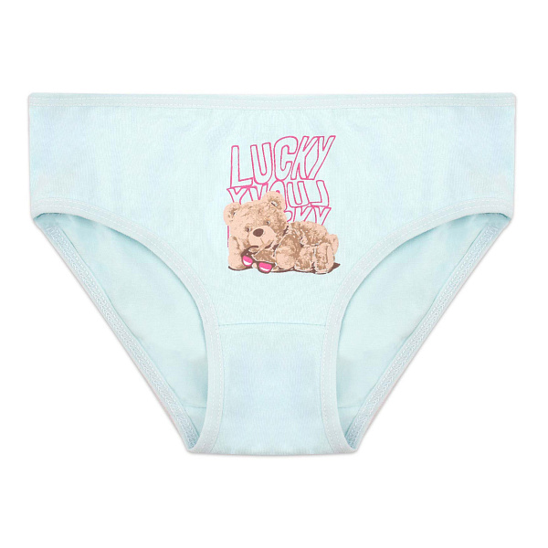 Трусы для девочки выполнены в голубом цвете. Изделие украшено милым принтом с изображением плюшевого медвежонка и надписью «LUCKY». Крой классический, обеспечивающий хорошую посадку и свободу движений, а также комфорт в течение всего дня.