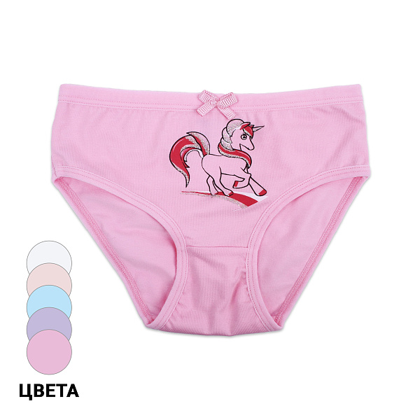 Трусы предназначены для девочек дошкольного возраста, в полной мере отвечают всем их потребностям. Для оформления использована нежная палитра красок. Украшением служат графические изображения сказочных животных, нанесенные методом термопечати. Классический крой гарантирует комфортную посадку, исключает нежелательное смещение белья.