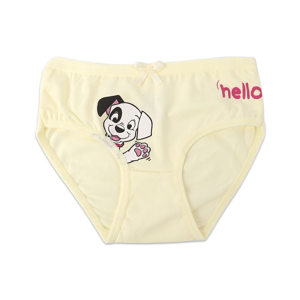 Девочкам особенно важно оформление даже нижней одежды. Именно по этой причине трусы пошиты в нежно-желтом оттенке и украшены принтом с изображением щенка далматинца. Посередине живота на резинке вшит маленький белый бантик.