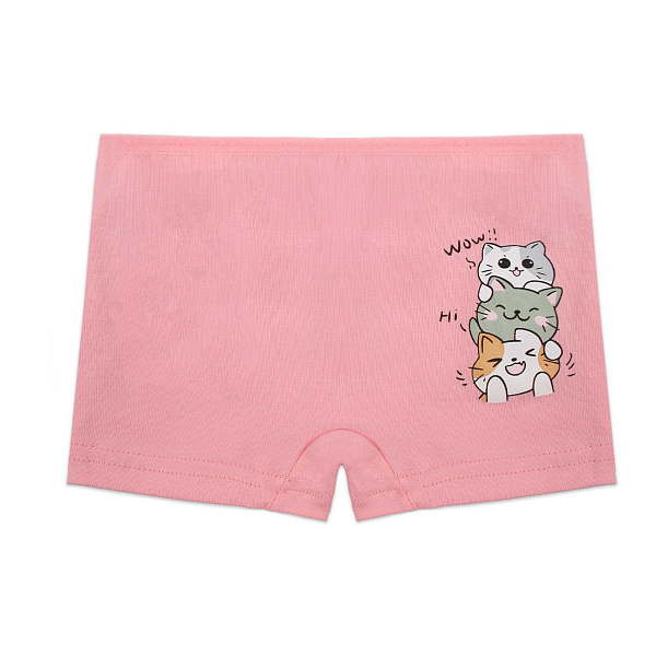 Трусы-шорты розового цвета станут прекрасным дополнением в гардероб девочки. На передней части изделие украшено милым принтом с изображением трех котят. Спокойный оттенок и аккуратный крой делают изделие комфортным и удобным в носке.