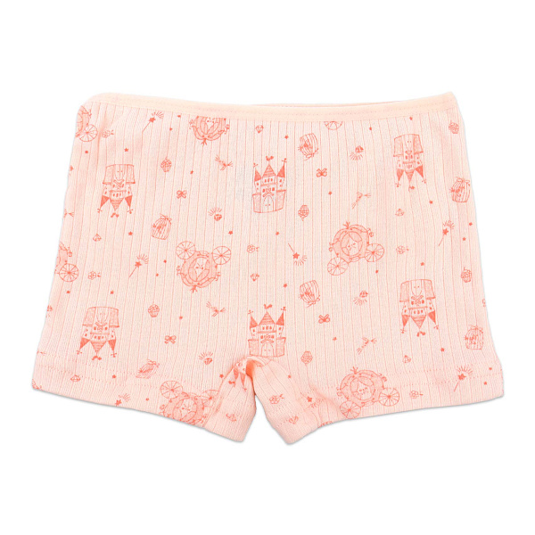 Трусы-шорты для девочек выполнены из хлопка в нежном персиковом цвете с ярким принтом в виде замков, карет и небольших декоративных элементов. Модель отличается мягкой и приятной к телу тканью, обеспечивающей комфорт и хорошую воздухопроницаемость. Удобный крой и аккуратная обработка краев позволяют изделию идеально сидеть и не сдавливать ребенка, что делает трусы-шорты отличным выбором для повседневной носки.