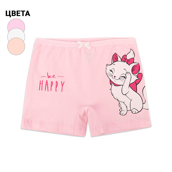 Трусы в форме шорт понравятся любой девочке. Они мягко облегают тело, не препятствуют нормальному кровообращению. Оригинальный крой обеспечит свободу движений, исключит нежелательное сползание белья во время активных игр и прогулок. Для оформления выбрана нежная цветовая гамма и изображения милой кошечки. Такой дизайн поднимет ребенку настроение, положительно повлияет на художественный вкус.