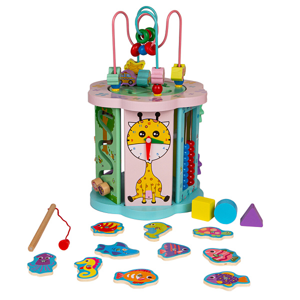 Центр развивающий бизиборд деревянный «Сказочный сад» – это развивающий уникуб с часами, геометрическими фигурами, пальчиковым лабиринтом и магнитной рыбалкой от бренда Lanson Toys.