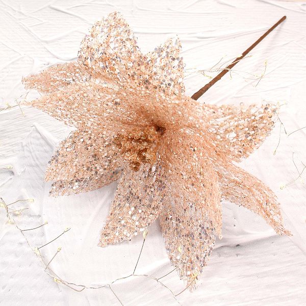 Декоративный цветок лилии в светло-пудровом оттенке — изящное украшение для праздничного интерьера и флористических композиций. Выполнен из пластика с ажурной текстурой, покрытой блестками, которые придают изделию сияние и воздушность. Высота цветка составляет 50 см, что делает его заметным акцентом в букетах или самостоятельным декоративным элементом.