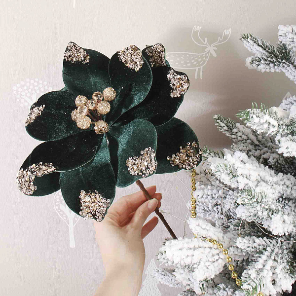 Декоративный цветок магнолии в насыщенном зеленом оттенке — выразительное украшение для праздничного интерьера и флористических композиций. Изготовлен из высококачественного велюра с бархатистой текстурой, что придает изделию благородство и визуальную глубину. Пестрые лепестки украшены блестками, создающими эффект мерцания и торжества. Высота цветка составляет 50 см, что позволяет использовать его как самостоятельный акцент или включать в букеты и интерьерные композиции. Цветок магнолии станет стильным дополнением в оформлении зимних праздников, придавая атмосфере насыщенность и элегантность.