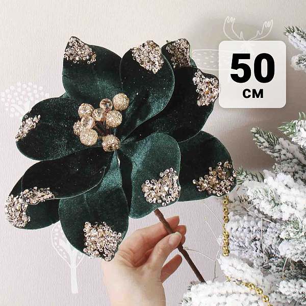 Цветок декоративный Магнолия с бархатной текстурой и блестящими золотистыми пайетками темно-зеленый 50см