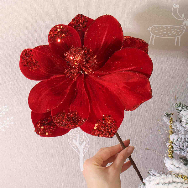Декоративный цветок магнолии в насыщенном красном оттенке — выразительное украшение для праздничного интерьера и флористических композиций. Изготовлен из высококачественного велюра с бархатистой текстурой, что придает изделию благородство и визуальную глубину. Пестрые лепестки украшены блестками, создающими эффект мерцания и торжества. Высота цветка составляет 50 см, что позволяет использовать его как самостоятельный акцент или включать в букеты и интерьерные композиции. Цветок магнолии станет стильным дополнением в оформлении зимних праздников, придавая атмосфере насыщенность и элегантность.