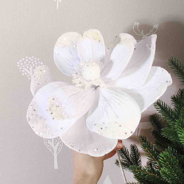 Декоративный цветок магнолии в белом цвете — выразительное украшение для праздничного интерьера и флористических композиций. Изготовлен из высококачественного велюра с бархатистой текстурой, что придает изделию благородство и визуальную глубину. Пестрые лепестки украшены блестками, создающими эффект мерцания и торжества. Высота цветка составляет 50 см, что позволяет использовать его как самостоятельный акцент или включать в букеты и интерьерные композиции. Цветок магнолии станет стильным дополнением в оформлении зимних праздников, придавая атмосфере насыщенность и элегантность.